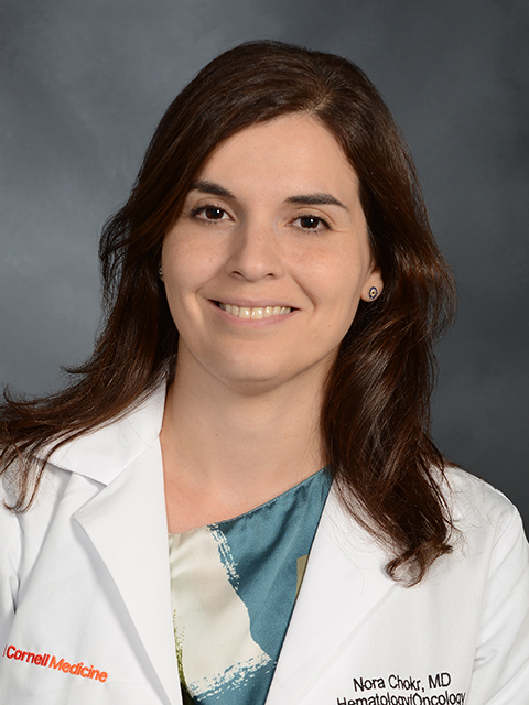 Nora Chokr, M.D., is an Assistant Professor of Medicine in the Division of Hematology and Medical Oncology at Weill Cornell Medicine/ NewYork-Presbyterian Hospital. She specializes in the care of patients with blood disorders who are in need of bone marrow or stem cell transplantation or cellular-based therapies, like chimeric antigen receptor (CAR) T-cell therapy. Dr. Chokr received her medical degree from the American University of Beirut Medical Center in Lebanon in 2015. She completed her Internal Medicine residency at Yale New Haven Hospital and her Hematology/Oncology fellowship at SUNY Downstate Medical Center, where she served as a Chief Fellow. Subsequently, she completed an advanced fellowship in Bone Marrow Transplantation and Immune Effector Cell Therapy at Weill Cornell Medicine (WCM)/NewYork-Presbyterian (NYP) Hospital. Upon completion of this advanced fellowship training, Dr. Chokr was recruited to join the faculty of the WCM/NYP Bone Marrow Transplantation Program. Dr. Chokr's main research interests focus on increasing transplant access and optimizing outcomes in older patients. Her interests also include the prevention of disease relapse and graft vs host disease after transplant. Dr. Chokr is an investigator for several clinical trials that aim to advance the field. She has publications in leading international peer-reviewed journals, and is a member of the American Society of Hematology (ASH), American Society for Transplantation and Cellular Therapy (ASTCT), ASTCT Aging Special Interest Group, Cancer and Aging Research Group (CARG). Dr. Chokr is also involved in teaching medical students, residents and fellows.
